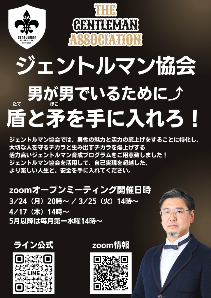 ジェントルマン協会では、男性の魅力と活力の底上げをすることに特化し、大切な人を守るチカラと生み出すチカラを爆上げする活力高いジェントルマン育成プログラムをご用意致しました!